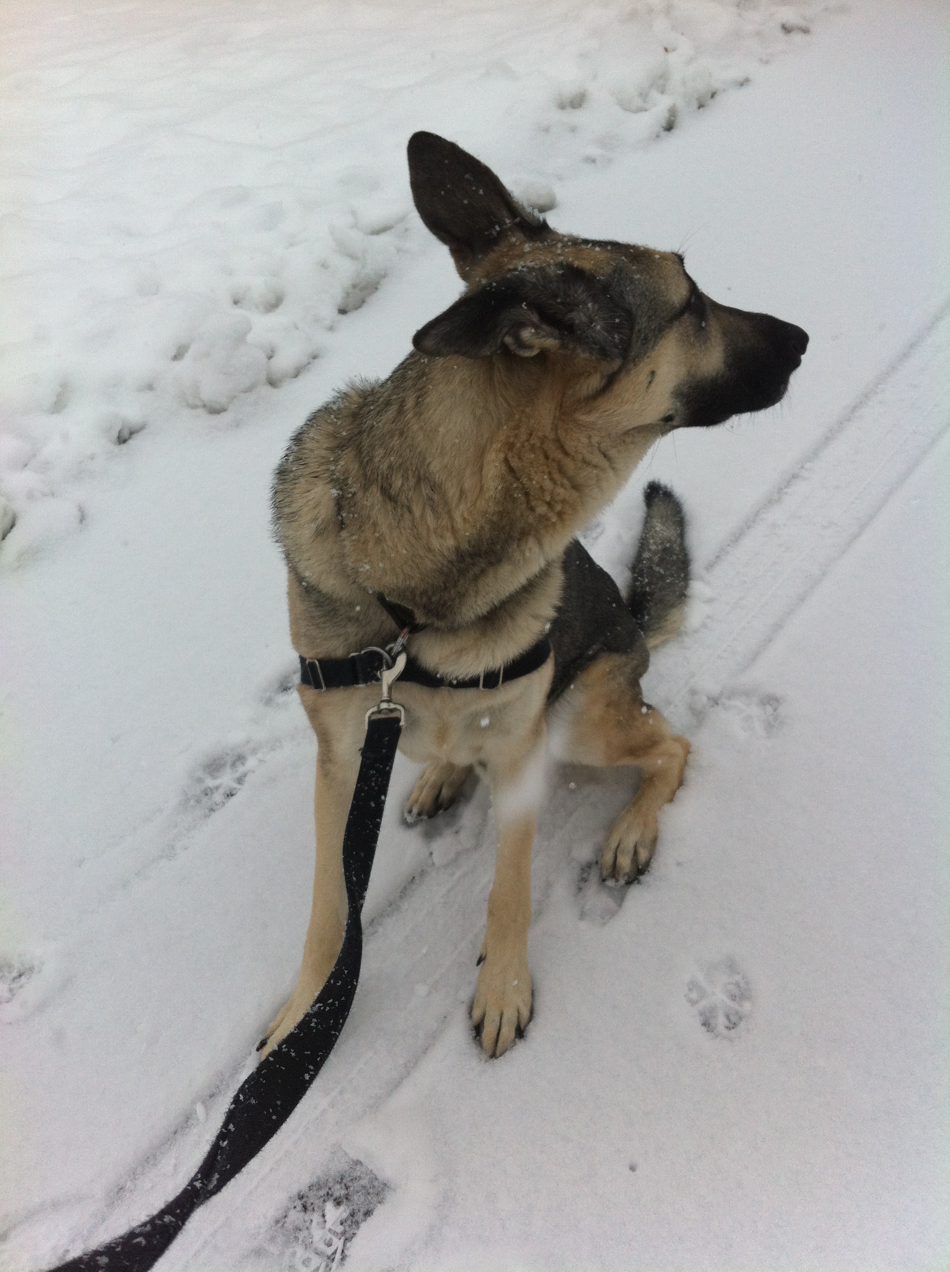 As I do every morning, last Saturday, I hooked a leash on my German Shepherd, Rodney. I then put on my snow boots and took him for a walk in the wintry mix. I even took pictures.