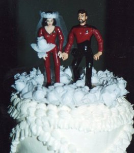 Unlike the two couples before us, we didn’t marry over Thanksgiving weekend nor did we get married in Michigan, Instead, our ceremony took place the Monday after Thanksgiving in Charleston, WV. And yes, our wedding was also simple and practical (my mother made my dress), but it was also a bit quirky. We received gifts of Star Trek dinnerware and had Star Trek action figures on top of our cake.