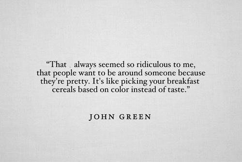 “That’s always seemed so ridiculous to me, that people want to be around someone because they’re pretty. It’s like picking your breakfast cereals based on color rather than taste.” John Green.
